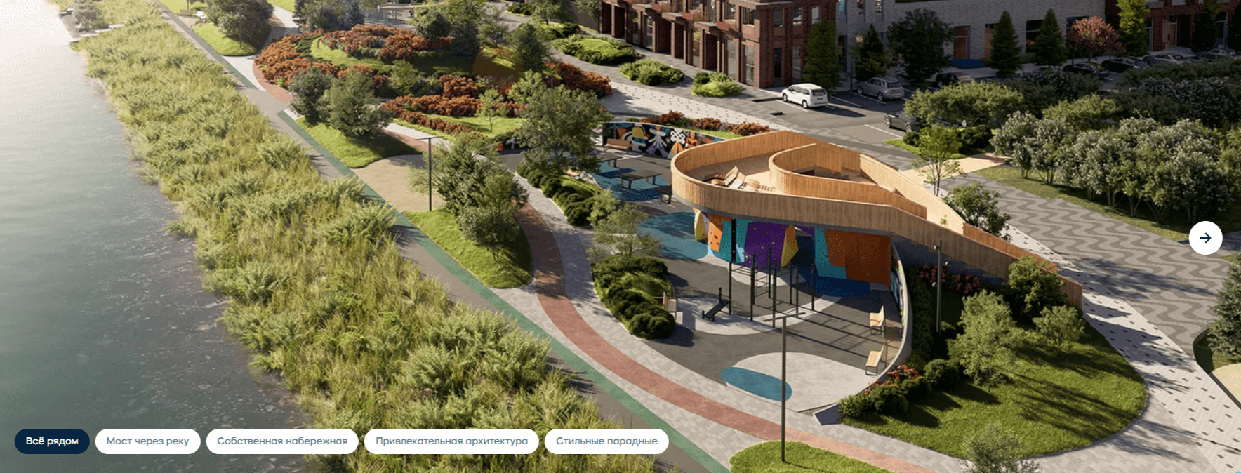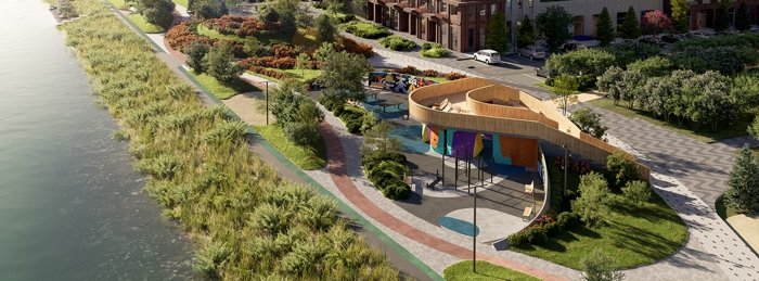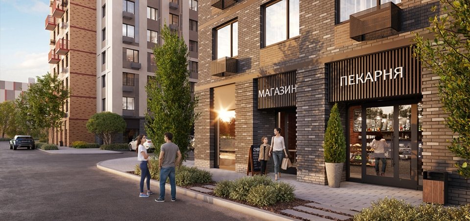 Собственная набережная с разделением зон, дворы с уникальным благоустройством (песочницы, батут, амфитеатр, патио), видеонаблюдение, закрытые дворы с доступом по Face ID. Торговая галерея на первых этажах, безбарьерная среда и тёплые тамбуры