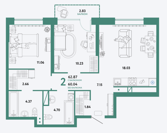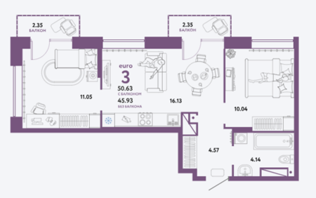 Площадь от 50.63 м2