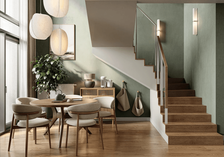 Территория поделена на южную (европейская сетка улиц, среднеэтажная застройка, приватные дворы, центральная площадь) и северную (открытые виды на Туру, линейные парки). В северной части — пешеходно‑торговая улица и площадь с дубом; юг и север связаны пешех/веломаршрутами и историческим кварталом вдоль Госпаровской. Набережная разделена на городскую, индустриальную и природную зоны; предусмотрен новый велопешеходный мост